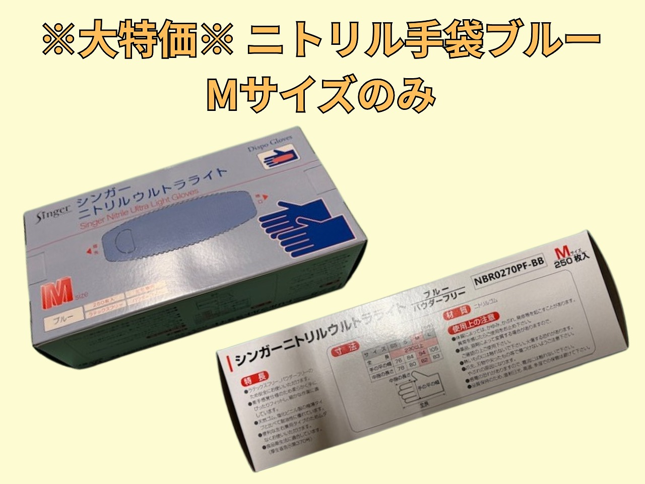 【在庫限り 大特価】 ニトリル手袋 シンガーニトリルウルトラライト ブルー 粉無し M(1箱250枚入)