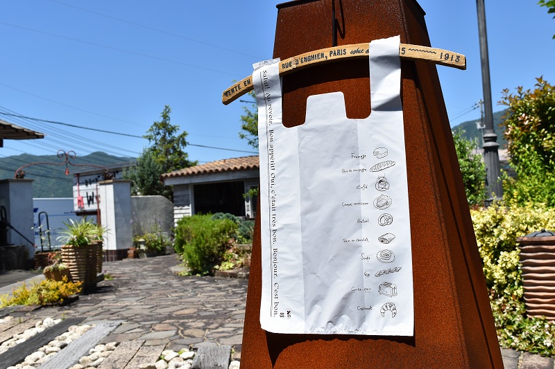 「pains」の絵柄とともにフランス語の様々な挨拶が並んでおります。