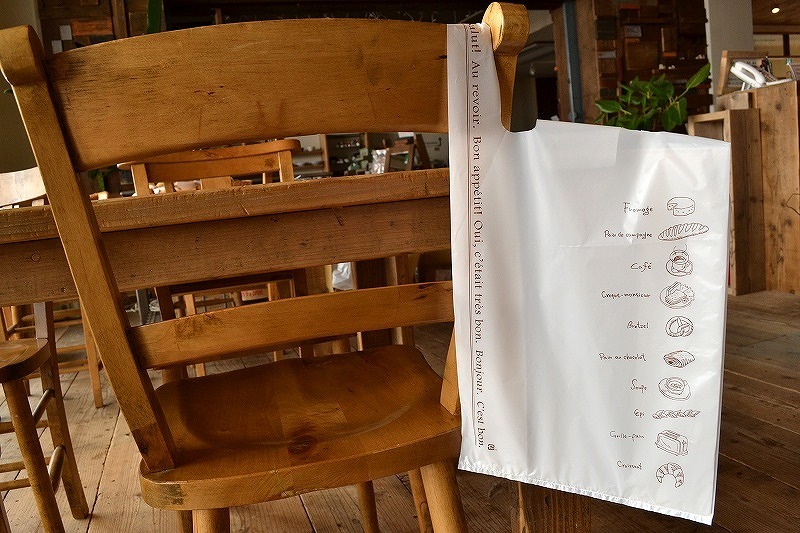 デザイン入りの乳白色のレジバッグです。
