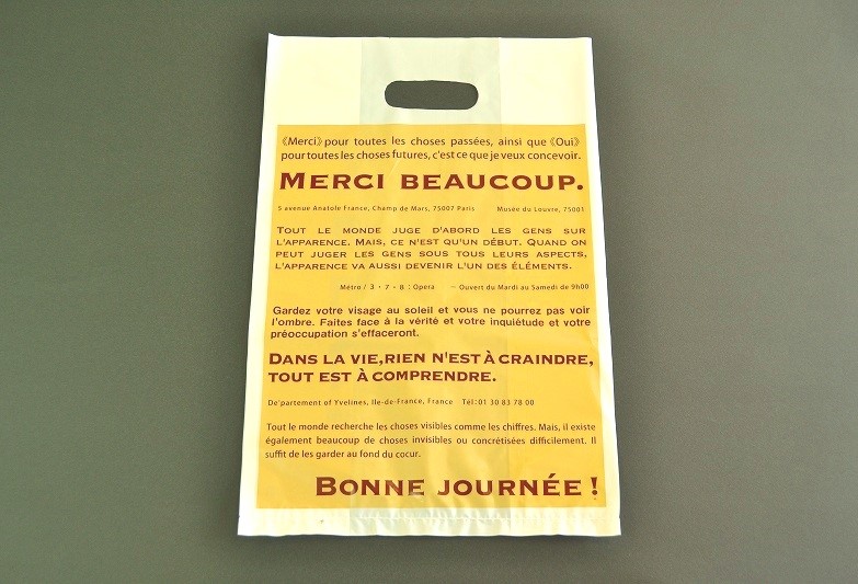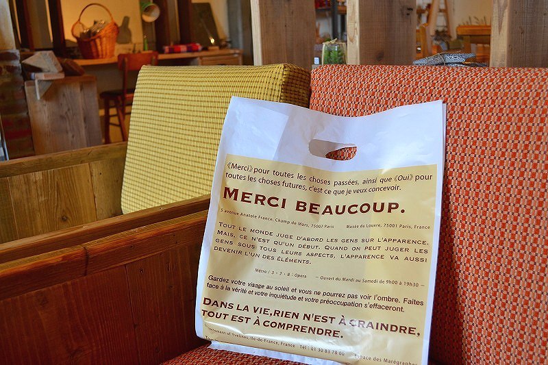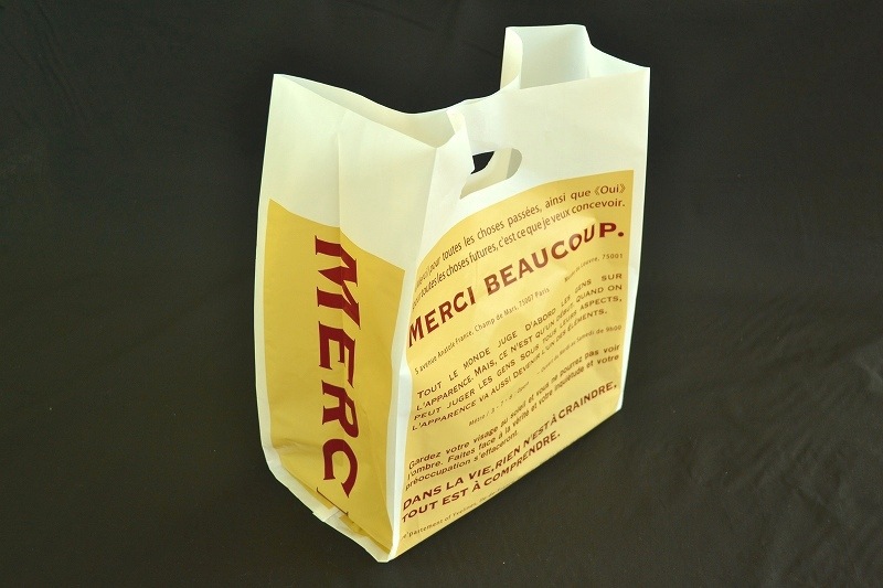 サイドガゼット(マチ)の片側には“Merci”(=仏語意:ありがとう)の印刷入り。