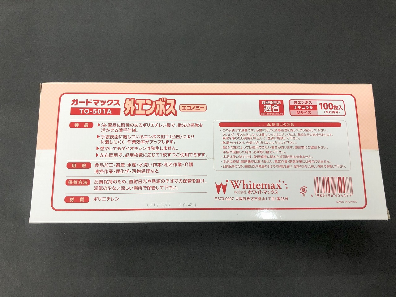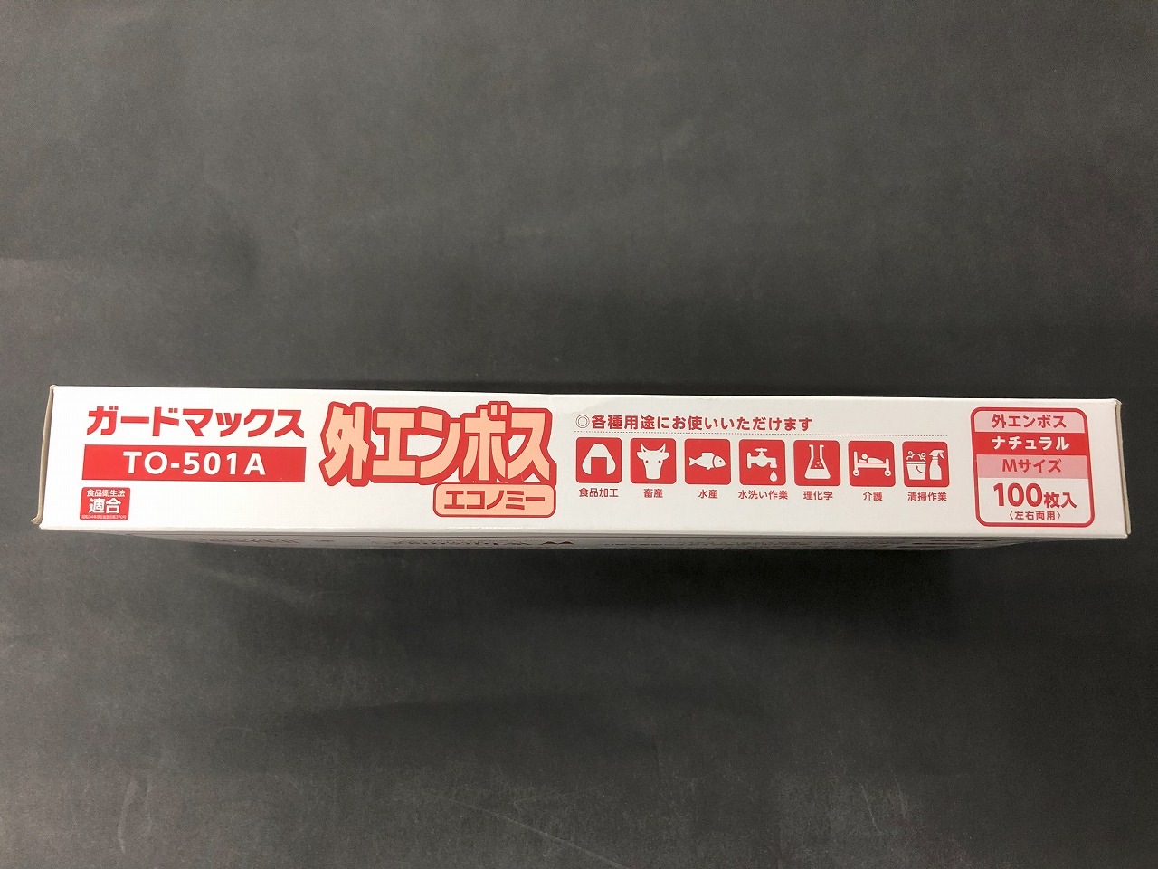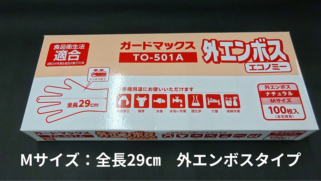 外エンボス加工なので、食品を取り扱う際に、剥離性・ひっつき防止に役立つポリ手袋となっています。
